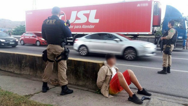 Equipes da PRF foram alertadas sobre um roubo de carga que estaria em andamento. Após receberem as características do veículo roubado, fizeram um bloqueio na pista sentido Rio, nas proximidades da Linha Vermelha. De acordo com a denúncia, um assaltante teria entrado pela janela de uma carreta que estava em movimento e rendido o motorista. Quando conseguiram abordar o veículo, os policiais renderam o suspeito. O adolescente de 17 anos, morador de São João de Meriti,ameaçava o motorista, de 39 anos, com uma arma de brinquedo.